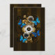 Composición de reloj de vapor redondo con dial numérico romano negro, decorado con arcos de oro y latón, mariposas morfo azules y lentes dañadas sobre fondo rayado marrón. Estilo Steampunk.