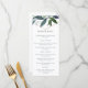 Esta tarjeta de menú de boda elegante y de moda presenta una forma geométrica de rosa dorada falsa rodeada de hermosas ramas de vegetación.