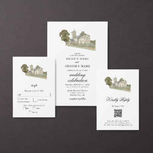 Un minimalista diseño de bodas de la iglesia acuarela. Un diseño tradicional de la iglesia que utiliza una tipografía clásica y caligrafía elegantes. Un encantador diseño de monograma de iglesia cristiana con tipografía moderna y elegante. Un elegante diseño de cartas de boda con temática de iglesia tradicional con elementos modernos. También hay disponibles invitaciones de boda coincidentes y otros artículos de papelería.