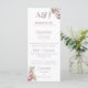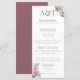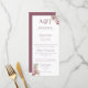 Esta elegante menú de boda presenta un tema floral elegante con hermosas flores de hortensia. Dos iniciales de monograma de muestra se imprimen en la parte superior. Puede personalizar el menú para incluir sus propias iniciales y opciones de comida personalizadas. Un delicado ramo de hortensias rosadas y blancas de acuarela se imprime en la parte superior derecha, y otro en la parte inferior izquierda.
