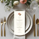 Stylish and chic with minimalist appeal. This wedding menu features a lovely floral rose bouquet alongside a contemporary set of fonts in olive green, against ivory backrounds.