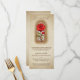 El menú personalizado presenta un tema mágico y encantador como la bella y la bestia. El fondo es un diseño rústico de papel de pergamino de aspecto antiguo. Una imagen de una rosa roja de vidrio teñido del clásico cuento de hadas se coloca cerca del centro, acentuado con un patrón de purpurina dorado. El saludo de Be our Guest se imprime en la parte superior en una hermosa letra de guión. Es perfecto para un brunch, una cena u otra ocasión mágica.