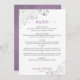 Este bonito menú boda es sencillo, elegante, sofisticado y elegante. Presenta un diseño elegante con caligrafía de guijarros de lavanda de encaje púrpura y delicados rizos y giros en las esquinas sobre un fondo blanco clásico. La parte posterior es de un hermoso color morado claro de mármol.