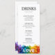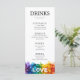 Esta elegante tarjeta de menú vertical de bebidas forma parte de la colección Boda LGBTQ+ Pinted With Love. Presenta un diseño llamativo con pinceladas de arcoiris en la parte inferior, creando una base animada para la audaz palabra blanca "AMOR". La parte delantera de la tarjeta es un menú de bebidas. Se organiza en secciones para cócteles, Espíritus, Vinos y Cervezas, con una variedad de opciones de bebida en cada rúbrica. El texto está limpio y es fácil de leer, lo que garantiza a los huéspedes la posibilidad de elegir rápidamente su bebida. La parte trasera de la tarjeta contiene un mensaje sincero y personalizado para sus huéspedes. El texto, titulado "Querido invitado", es una cálida invitación para que se complacen con las bebidas hechas a mano y se unan a la celebración. El mensaje termina con una cariñosa despedida de la pareja feliz. Esta tarjeta de doble cara no sólo es una guía práctica para los huéspedes, sino también un bello y sentimental recuerdo de tu día especial.