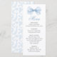 Sweet and elegant coquette themed baby boy shower menu cards featuring a charming light blue coquette bow and a delicate baroque-inspired pattern on the back. This refined design blends soft baby blue tones with vintage inspired details, creating a stylish and sophisticated touch for your celebration.