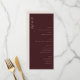 This elegant wedding menu features a sophisticated maroon background with an understated, cursive "menu" script at the top, exuding timeless charm and refinement. The layout is clean and modern, listing starters, salad, main course, and dessert options in a simple yet stylish font that complements the overall design. Perfect for a classic or formal wedding celebration, this menu conveys a sense of warmth and sophistication, ensuring your special day feels both memorable and tastefully curated. Customize it to reflect your unique culinary choices and create a cohesive dining experience for your guests.