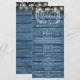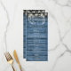 Tarjeta de menú de boda floral con luces de cadena elegantes con nombres de estilo de firma, esta tarjeta de menú moderna se puede personalizar con su información en letra blanca chic sobre un fondo de madera azul rústico. Diseñado por Thisisnotme©