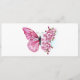 Arreglo floral de mariposa rosa con flores japonesas de cerezo rosadas sobre fondo blanco.