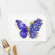 Joyería, azul, zafiro, mariposa de flor brillante con ala decorada con flores azules preciosas con hojas de oro sobre fondo blanco.