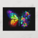 Arcoiris, mariposa monarca luminosa, pintada de forma artística con ramo de iridiscente, rosas brillantes y luminiscentes sobre fondo negro. Mariposa arcoiris.