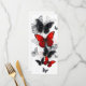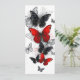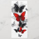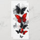 Montón de mariposas voladoras, realistas, rojas y negras morfo sobre fondo blanco con gotas de pintura.