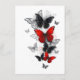 Montón de mariposas voladoras, realistas, rojas y negras morfo sobre fondo blanco con gotas de pintura.