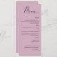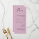 Tarjeta de menú de boda o recepción de cena elegante en color malva. Diseño contemporáneo, simple y elegante con hermosa caligrafía moderna a mano. Color de fondo frontal y posterior en tono de lila malva. Posibilidad de cambiar el color de fondo tanto frontal como posterior seleccionando "personalizar más". Diseño disponible en una variedad de opciones de color. Parte de nuestra colección "Letreros y productos para eventos en malva y púrpura" con una variedad de productos coordinados disponibles, incluyendo tarjetas de plan de asientos, números de mesa y letreros para eventos.