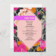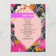 Forma geométrica rosa claro de 6 lados sobre naranja rosa y color melocotón floral moderno con un diseño marbleizado oscuro. Texto rosado "menú" sobre barra violeta brillante con texto negro debajo.