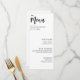 Presentamos la tarjeta de menú de una sola cara de la colección Elegance, una manera concisa y de buen gusto para presentar sus deliciosas ofertas en la celebración. Esta carta, diseñada en el elegante estilo de la colección, ofrece una mirada atenta a las delicias culinarias que los clientes pueden anticipar. El formato de un solo lado está decorado con líneas depuradas y estética moderna, creando una presentación visualmente llamativa. Las categorías de menú -Aperitivos, cursos principales, postres y bebidas- se presentan con elegancia, prometiendo una experiencia culinaria tan refinada como su historia de amor. Dentro de cada categoría, las ofertas específicas se pueden describir en un texto de personalizable. Adapte las descripciones del menú para alinearlo perfectamente con su estilo único, asegurándose de que cada detalle de la presentación refleje la belleza e individualidad de su celebración. Como parte de la colección Elegance, esta carta de menú de un solo lado es totalmente personalizable para armonizarla con el tema boda, creando una estética coherente y elegante que le da un toque de elegancia a su experiencia. La tarjeta de menú de la colección Elegance, perfectamente sofisticada y deliciosamente concisa, ofrece un vistazo al viaje culinario que le espera a sus huéspedes. Es una extensión de la refinada belleza de su celebración, asegurando que todos los detalles, incluido el menú, estén cuidadosamente diseñados para realzar la experiencia general