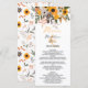 Disfrute de la calidez del sol de campo con nuestro menú de boda naranja, rústico y acogedor, adornado con hermosos girasoles, hojas verdes y ramas rojas marrones. Perfecto para la pareja de espíritu libre. con una tipografía de escritura cepillado sobre un sencillo fondo blanco editable.