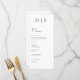 Este minimalista y elegante diseño de menú nupcial incluye nombres de monogramas con tipografía caligráfica clásica. Un sencillo y clásico diseño de menú boda para vestir las mesas con gusto y adecuarse a la temática boda a través de las ideas de decoración boda.