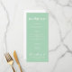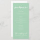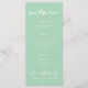 Este suave menú de boda verde menta presenta una tipografía blanca de moda para una dulce ceremonia al aire libre de primavera. Sencillo y elegante guión sobre tranquilos y sólidos menús verde pastel para una recepción en el jardín.