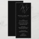 Elegante Moda Monograma Iniciales Menú Boda Blanco Negro. Magnífico y sofisticado menú boda de diseño con texto en blanco sobre negro con llamativas iniciales en monograma gris pálido sobre negro. Personalice con el nombre de la novia y de la novia, la fecha de Boda, las iniciales del monograma y el texto del menú Boda. Todos los textos, tipos de letra y colores son personalizables. Le invitamos a visitar nuestra tienda, Austen & Grace, para ver la suite boda completa, productos a juego y más. Póngase en contacto con nosotros si necesita ayuda.