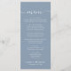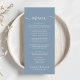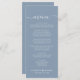 Moderno menú azul polvoriento para tu boda, fiesta de compromiso, cena de ensayo y otras celebraciones de bodas con "menú" en un guión de caligrafía blanca de moda con toques, tu menú personalizado en tipografía blanca simple, tus primeros nombres unidos por un corazón y tu fecha de evento.