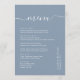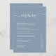 Moda polvoriento menú de cena de la recepción de bodas azul con "menú" en un elegante guión de caligrafía blanca con toques, menú personalizado en una simple tipografía blanca moderna, sus nombres unidos por un corazón y la fecha de recepción.