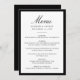 This modern wedding menu features “Menu” in elegant black calligraphy, paired with refined serif lettering for the couple’s names, wedding date, and reception courses. A bold black border frames the layout, creating a clean and structured look that feels timeless and polished. The classic typography and strong contrast offer a sophisticated presentation for your dining selections, making this menu a beautiful addition to formal, modern, and traditional wedding table settings.