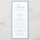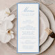 This wedding menu features soft light blue calligraphy at the top, paired with clean serif lettering for the couple’s names, wedding date, and dinner courses. The pale blue border adds a fresh, airy touch that feels perfect for spring, summer, and coastal weddings. With its crisp contrast and elegant layout, this menu card offers a bright yet polished way to display your dining details at each place setting.
