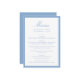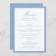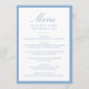 This wedding menu features “Menu” in soft light blue calligraphy, paired with classic serif lettering for the couple’s details and dining selections. A pale blue border frames the design with an airy, graceful look that feels perfect for spring, summer, and coastal celebrations. The clean layout keeps the focus on the menu while adding a subtle touch of color to your table setting.