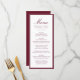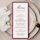 This wedding menu features “Menu” in rich burgundy calligraphy, paired with classic serif typography for the couple’s names, wedding date, and reception courses. The deep burgundy border frames the design with warmth and sophistication, making it an elegant choice for formal, romantic, and evening celebrations. With its refined layout and timeless color palette, this menu card presents your dining selections in a polished, cohesive style that complements a classic wedding table setting.