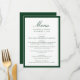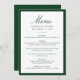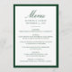 This wedding menu is styled with elegant dark green calligraphy for the “Menu” heading, paired with refined serif lettering for the couple’s information and menu details. A rich green border adds depth and sophistication, making this design especially fitting for estate, garden, and classic wedding settings. The balanced composition offers a polished way to showcase each course with understated elegance.