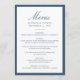 This wedding menu features “Menu” in flowing navy calligraphy, with the couple’s names, wedding date, and dining selections arranged below in classic serif type. The navy border frames the layout with a crisp, tailored feel that suits traditional, coastal, and formal weddings. The structured design and rich color palette create a refined presentation for your reception courses and place settings.