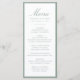 This wedding menu is styled with soft sage green calligraphy for the “Menu” heading, complemented by refined serif text for the names, date, and dining selections. The muted green border creates a calm, organic contrast against the white background, making it especially well-suited for botanical, garden, and romantic wedding themes. The airy color palette and structured layout provide a graceful way to present your reception menu while keeping the overall look light and elegant.