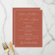Este moderno y elegante menú de eventos o bodas cuenta con un fondo de terracota. Los nombres de la pareja se imprimen en una letra de guión. Puede personalizar los elementos del menú con sus propias opciones de comida.