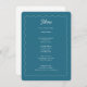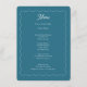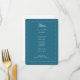 Esta carta moderna y audaz en forma redondeada cuenta con un marco ondulado, un guión inspirado en la retro y un menú para la cena o un menú boda sobre el fondo azul Verde azulado. Perfecto para un boda moderno o cualquier otro evento elegante. En la parte posterior hay espacio para sus nombres y fecha de boda - o simplemente borrar el texto de la parte posterior. En la herramienta de diseño se pueden cambiar todos los colores de esta tarjeta de menú boda (color de fondo, texto y marco ondulado).