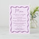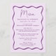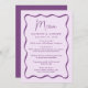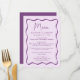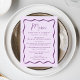 Añada un toque vintage a su fiesta de compromiso, cena de ensayo o recepción de boda con este moderno menú boda de marco ondulado morado. El diseño muestra los nombres de la pareja, la fecha de boda y las opciones de menú en negrita con letras violetas rodeadas de un borde oscuro de marco ondulado violeta contra un fondo morado claro. El menú retro boda coordina con nuestra colección Modern Wavy Frame boda.