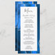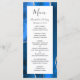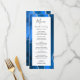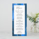 Elegante y moderno menú boda decorado con un fondo de agate azul real de color acuático adornado con un purpurina de imitación plateado. El texto aparece en letra elegante de color gris carbón vegetal y fuentes de copperplate en un rectángulo blanco. El diseño de agate se repite al revés.