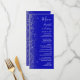 El lado izquierdo de este elegante y moderno menú boda presenta un diseño purpurina de imitación plateada. El texto del personalizable combina la escritura a mano en blanco, la copperplate y las letras cursivas en un fondo azul real. El reverso presenta un diseño de purpurina azul real y plateado a juego.
