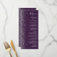 El lado izquierdo de este elegante y moderno menú boda presenta un diseño purpurina de imitación plateada. El texto del personalizable combina la escritura a mano gris plateado, el copperplate y las fuentes cursivas en un fondo morado oscuro. El reverso presenta un diseño de purpurina morado y plateado a juego.