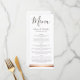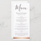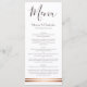 En la parte inferior de la carta, una carta moderna de boda blanco con dos adornos de rayas de cobre. Este menú incluye los nombres de la novia y del novio y la fecha de su boda junto con un amplio espacio para incluir las selecciones de menú.