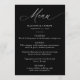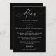Este elegante menú nupcial presenta la palabra "Menú" en una elegante caligrafía blanca sobre un fondo negro de moda, ofreciendo un sofisticado look para su día especial. Personalízalo añadiendo tus nombres, fecha de boda y un menú detallado con letras blancas en negrita. El diseño moderno, sencillo y elegante es perfecto tanto para bodas formales como informales, lo que lo convierte en una adición versátil a la recepción de bodas. Ya sea que esté organizando una velada de verano o una celebración de invierno, este elegante menú boda complementará la estética de su evento y realzará su experiencia gastronómica.