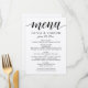 Papel kraft rústico moderno y moda y tarjetas de menú boda negro con un diseño tipográfico negro elegante con acentos de escritura de caligrafía audaz y un elegante texto personalizado que se puede personalizar con los deliciosos detalles del menú de la cena y un monograma de nombres de novios y novios y fecha boda.