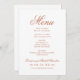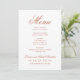 El diseño formal de la tarjeta de menú boda de terracota naranja presenta una hermosa tipografía que combina un guión de caligrafía floreciente tradicional con letras de bloques clásicas. Incluye un acento de diseño de desplazamiento decorativo. El texto del personalizado puede ser personalizado con un monograma de los nombres de la novia y del novio y la fecha del boda, así como los detalles del menú de la cena para el día de la boda. Por favor, compre nuestra colección de Bodas Naranjas de Terracota Clásico Elegante para coordinar diseños.