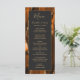 Elegante y moderno menú boda con un naranja de acuarela quemado y decorado con un purpurina de imitación dorada. El texto aparece en letra elegante de color dorado y fuentes de copperplate en un rectángulo oscuro fuera de negro. El diseño de agate se repite al revés.