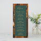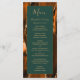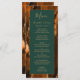 Elegante y moderno menú boda con un naranja de acuarela quemado y decorado con un purpurina de imitación dorada. El texto aparece en elegantes letras de color dorado y fuentes de copperplate en un rectángulo verde oscuro. El diseño de agate se repite al revés.