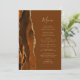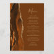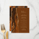 En el lado izquierdo de este elegante y moderno menú boda, la orilla de la aguja acuática en tonos rojizos y naranjas quemados, adornada con un falso purpurina de oro. El texto del personalizable combina guiones de escritura a mano de color dorado y fuentes de copperplate en un fondo marrón de nuez moscada. El reverso presenta un diseño de óxido y agate dorado a juego.