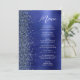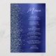This elegant modern wedding menu features a faux diamond glitter border on a navy blue faux brushed metal background. The customizable text combines white handwriting script and sans serif fonts. The navy blue brushed metal and glitter design is repeated on the reverse side.