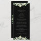 Un menú boda negro de cuatro platos, con un borde de nevadas pintadas a mano y eucaliptos en la parte delantera y una corona en la parte trasera. Todo el texto es completamente editable, y los puntos dispersos en la parte delantera y trasera se pueden borrar antes de pedir si lo prefiere. Vea esta colección en mi tienda para menús con arreglos florales alternativos y en diferentes tamaños, colores y formas. También hay elementos de coordinación disponibles.