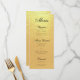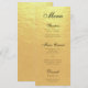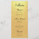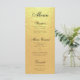 Un menú de oro falso que utiliza elegante escritura caligráfica para título y subtítulos. Todo el texto es negro. Recomendado para una boda con colores negro y dorado, pero se puede utilizar en otras ocasiones.