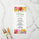 La carta es colorida, con un borde superior e inferior de suculentas flores tropicales en tonos cálidos y vibrantes, todo ello sobre un fondo blanco fresco. Puede hacer clic en el vínculo personalizar para agregar sus propios detalles de menú. También puede cambiar el estilo de fuente y el color a su gusto. Forma parte de una magnífica suite boda que puede ser totalmente personalizada.
