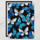 Mariposas realistas, azules y blancas, sin fisuras en el fondo negro.